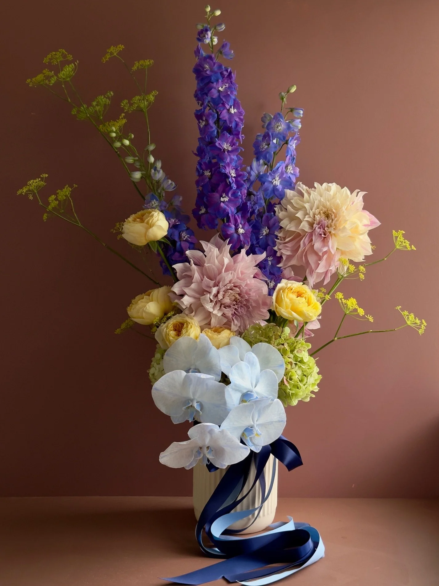 Our largest offering. A grand vase arrangement full of lush florals that really make a statement! The perfect gift for that special someone. Hand picked & arranged by us in a sleek vase for you to keep.